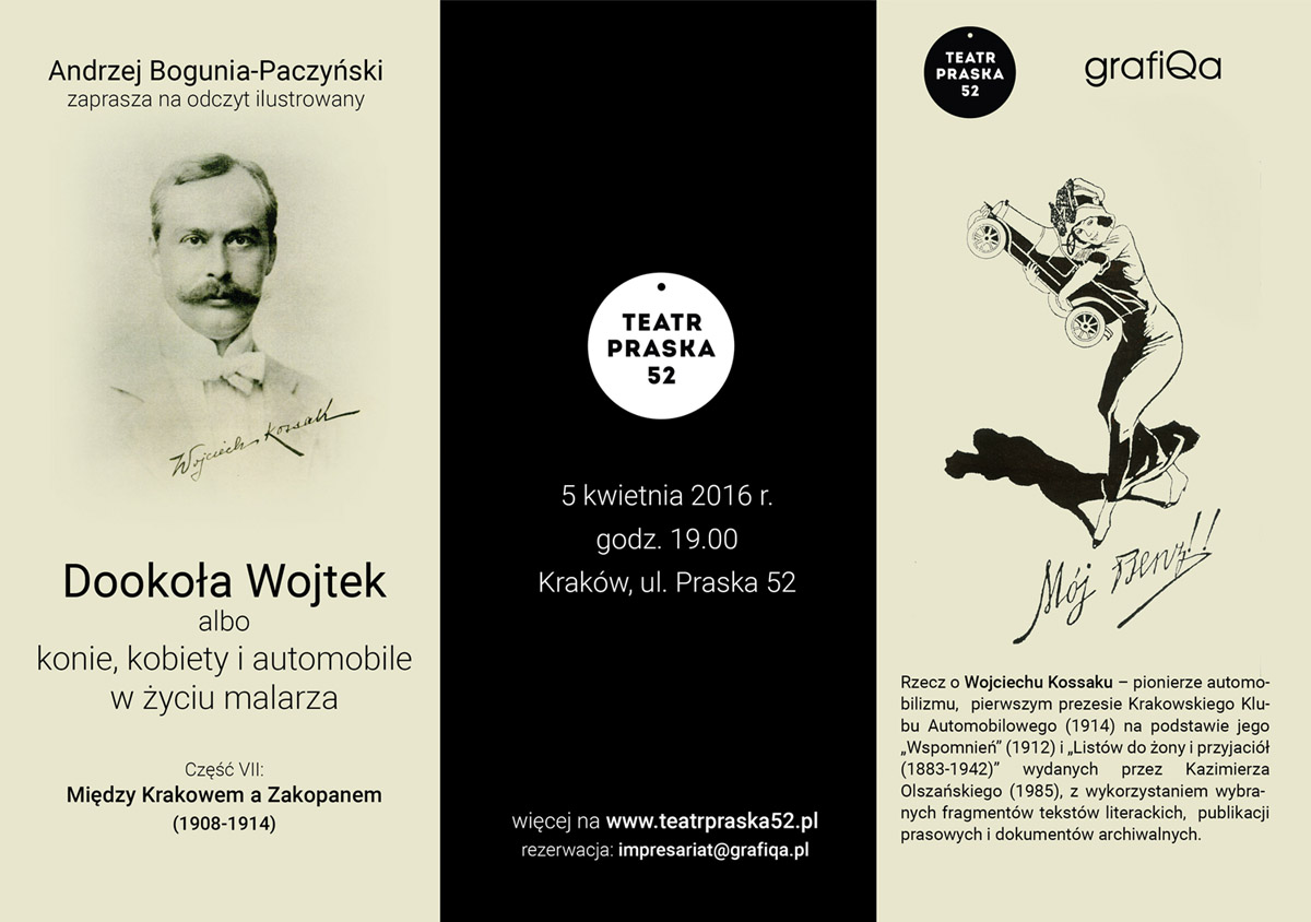Rzecz o Wojciechu Kossaku - pionierze automobilizmu, pierwszym prezesie Krakowskiego Klubu Automobilowego (1914) na podstawie jego „Wspomnień” (1912) i „Listów do żony i przyjaciół (1883-1942)” - wydanych przez Kazimierza Olszańskiego (1985), a także wybranych fragmentów tekstów literackich, publikacji prasowych i dokumentów archiwalnych